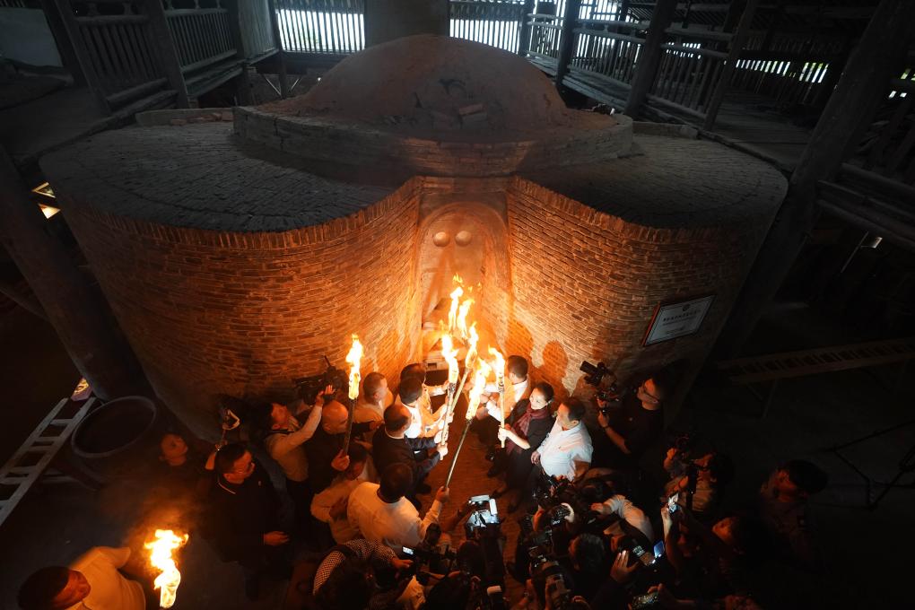 2023年10月19日,嘉賓與把樁師傅一起對葫蘆窯進(jìn)行復(fù)燒點(diǎn)火。當(dāng)日,作為2023中國景德鎮(zhèn)國際陶瓷博覽會(huì)的活動(dòng)之一,景德鎮(zhèn)古窯民俗博覽區(qū)對重建的明代葫蘆窯進(jìn)行點(diǎn)火復(fù)燒。同時(shí),景德鎮(zhèn)歷代瓷窯活態(tài)傳承紀(jì)實(shí)館開館。新華社記者 周密 攝