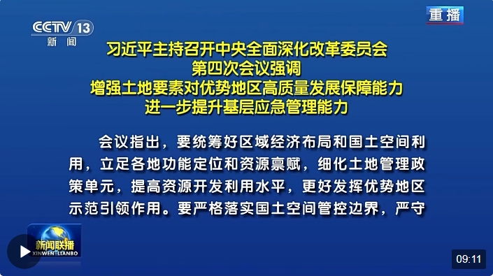 中共中央總書記、國家主席、中央軍委主席、中央全面深化改革委員會主任習近平2月19日下午主持召開中央全面深化改革委員會第四次會議,審議通過了《關于改革土地管理制度增強對優(yōu)勢地區(qū)高質量發(fā)展保障能力的意見》、《關于促進經濟社會發(fā)展全面綠色轉型的意見》、《關于進一步提升基層應急管理能力的意見》、《關于加快形成支持全面創(chuàng)新的基礎制度的意見》、《中央全面深化改革委員會2023年工作總結報告》、《中央全面深化改革委員會2024年工作要點》。