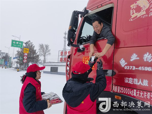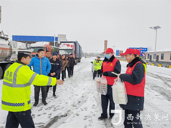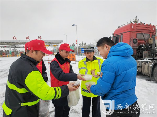 這有小米粥、炸油餅,雞蛋還熱乎著……”榆靖分公司志愿者暖心地喊著話。“行動是最好的破冰劑”,志愿者們?yōu)楦咚贉袈每退腿ナ澄?,頂風冒雪分發(fā)給滯留在收費站的司乘人員。一件件穿梭在寒風中的“紅馬甲”此刻成為了冬日里最美的“志愿紅”,讓群眾在寒意逼人的天氣里感受到了一份特別的溫暖。大家紛紛表示感謝,“熱粥、小菜、松軟的饅頭下肚,全身都熱乎了。”一名滯留司機真誠地感激道。