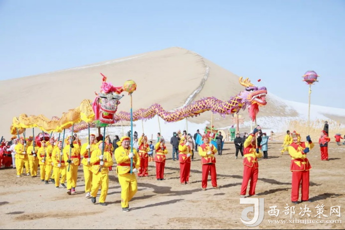 雪后的沙山與熱鬧非凡的社火表演,交織出一幅令人心花怒放的秀麗畫卷,游人近距離觀看社火表演,鉆龍、合影,祈福納祥,眾人歡聲笑語不斷,在社火中感受中國傳統(tǒng)節(jié)日獨(dú)有的民俗魅力,盡享年味敦煌。