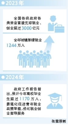 2023年,全國各級政府各類資金直接支持就業(yè)、創(chuàng)業(yè)超過3000億元,并采取支持高校畢業(yè)生等青年就業(yè)、城鄉(xiāng)困難群眾就業(yè)等針對性措施,全年城鎮(zhèn)新增就業(yè)1244萬人。