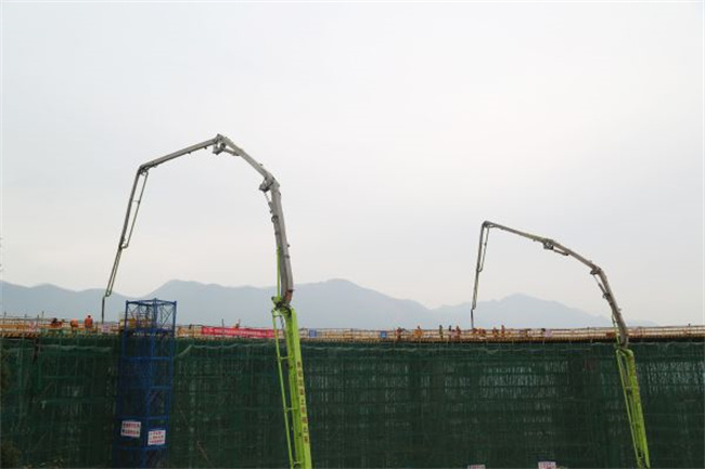 長慶互通B匝道橋上部結構為鋼筋混凝土連續(xù)箱梁,長約100米,混凝土體積705立方米,采用盤扣式滿堂支架現(xiàn)澆法施工。為保障混凝土澆筑安全和質量,項目部主要管理人員現(xiàn)場帶班,旁站監(jiān)理工程師現(xiàn)場履職,并配置46米混凝土泵車2臺,混凝土攪拌運輸車8臺。