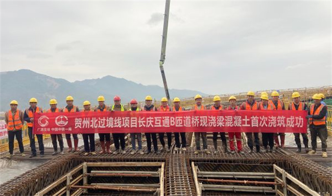 3月6日下午3點,經(jīng)過作業(yè)人員8個小時連續(xù)鏖戰(zhàn),由中鐵一局三公司承建的賀州北過境線長慶互通B匝道橋完成首次350方混凝土澆筑,按下了項目復工復產(chǎn)的加速鍵。