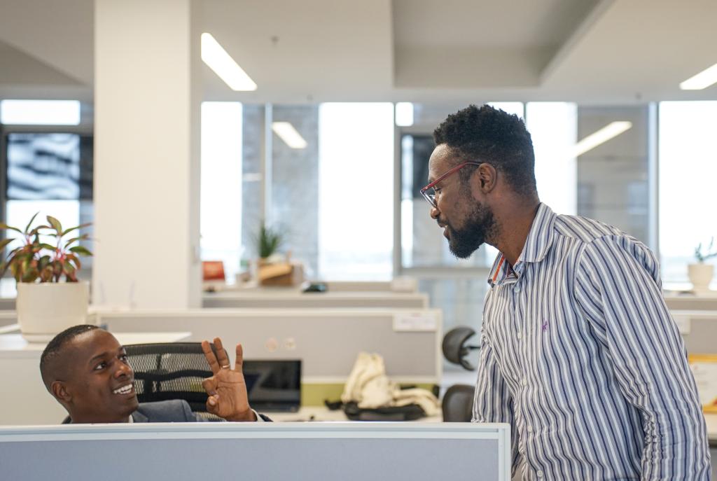 在安哥拉首都羅安達(dá)華為安哥拉科技園區(qū),路易斯·埃里瓦爾多(右)和同事交談。