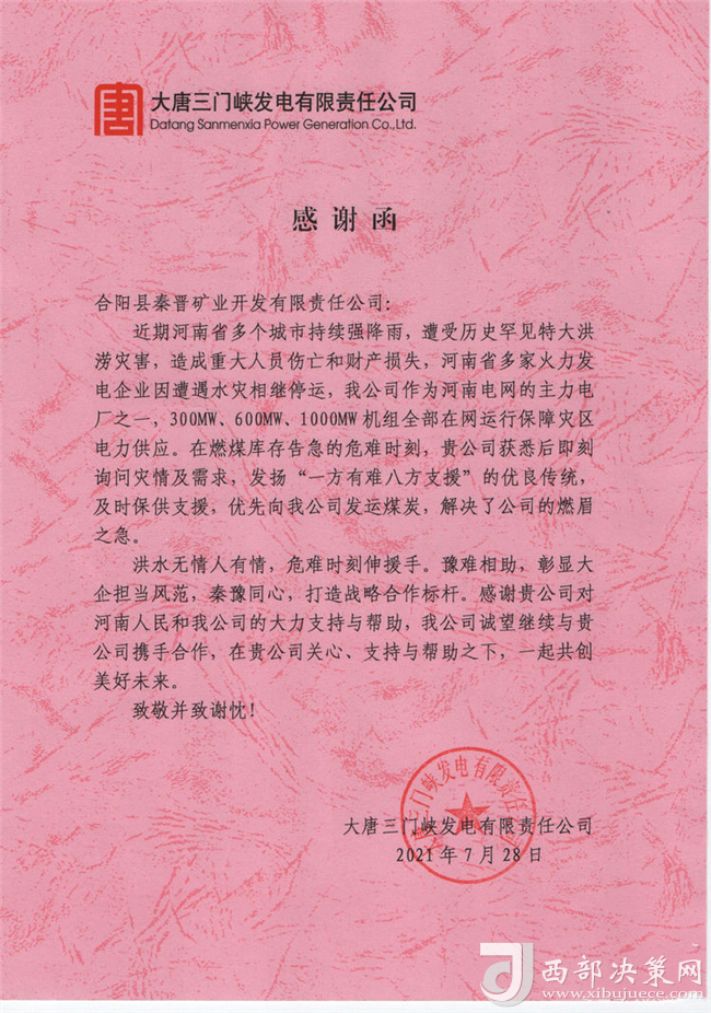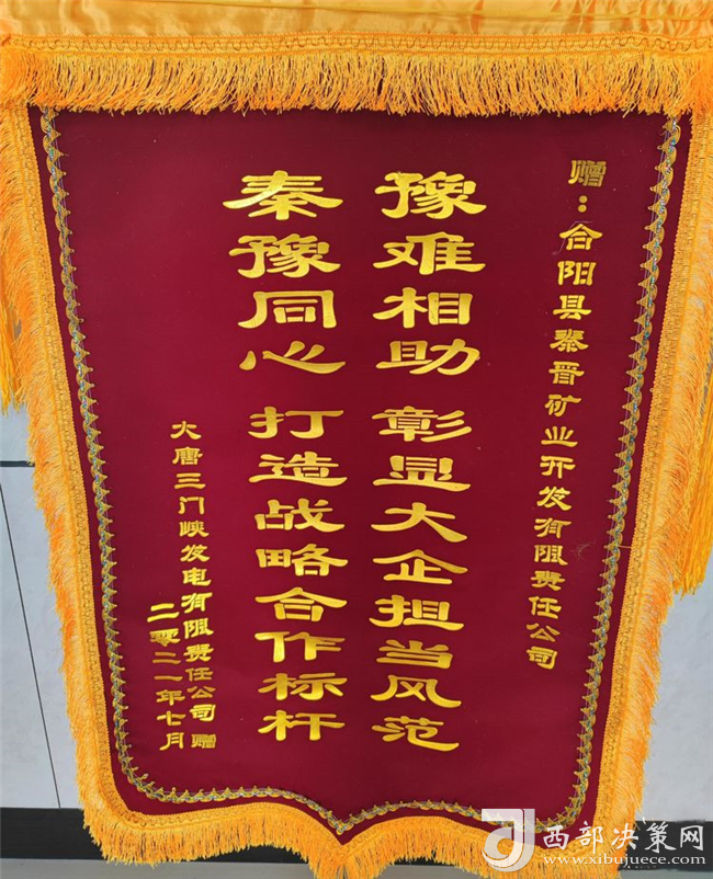 近日,大唐三門峽發(fā)電有限公司為秦晉集團(tuán)公司送來(lái)了感謝函,并將一面寫有“豫難相助,彰顯大企擔(dān)當(dāng)風(fēng)范,秦豫同心,打造戰(zhàn)略合作標(biāo)桿”的錦旗送到了秦晉集團(tuán)公司,對(duì)秦晉集團(tuán)“一方有難八方支援”的大愛(ài)精神表示感謝?。▓D/文:聶曉英)