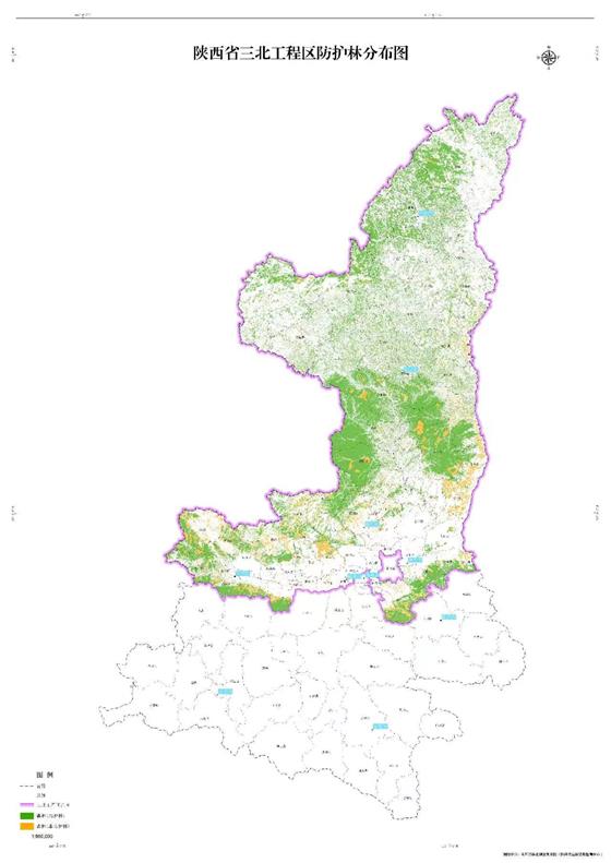 “三北工程”是“防護林”工程,也是中國生態(tài)文明建設的重要標志性工程。1978年11月25日,國務院批準實施三北防護林體系建設工程(簡稱“三北工程”),規(guī)劃期由1978年到2050年,規(guī)劃區(qū)總面積65億畝。“三北工程”是人類最具雄心的生態(tài)工程。陜西是“三北工程”之省,秦嶺以北的黃河流域,包括秦嶺北麓、關(guān)中平原、渭北旱塬、丘陵溝壑、毛烏素沙地,皆是“三北工程”區(qū)。陜西“三北工程”區(qū)總面積1.83億畝,占全省土地面積的59.29%、占全國“三北工程”區(qū)面積的2.8%。